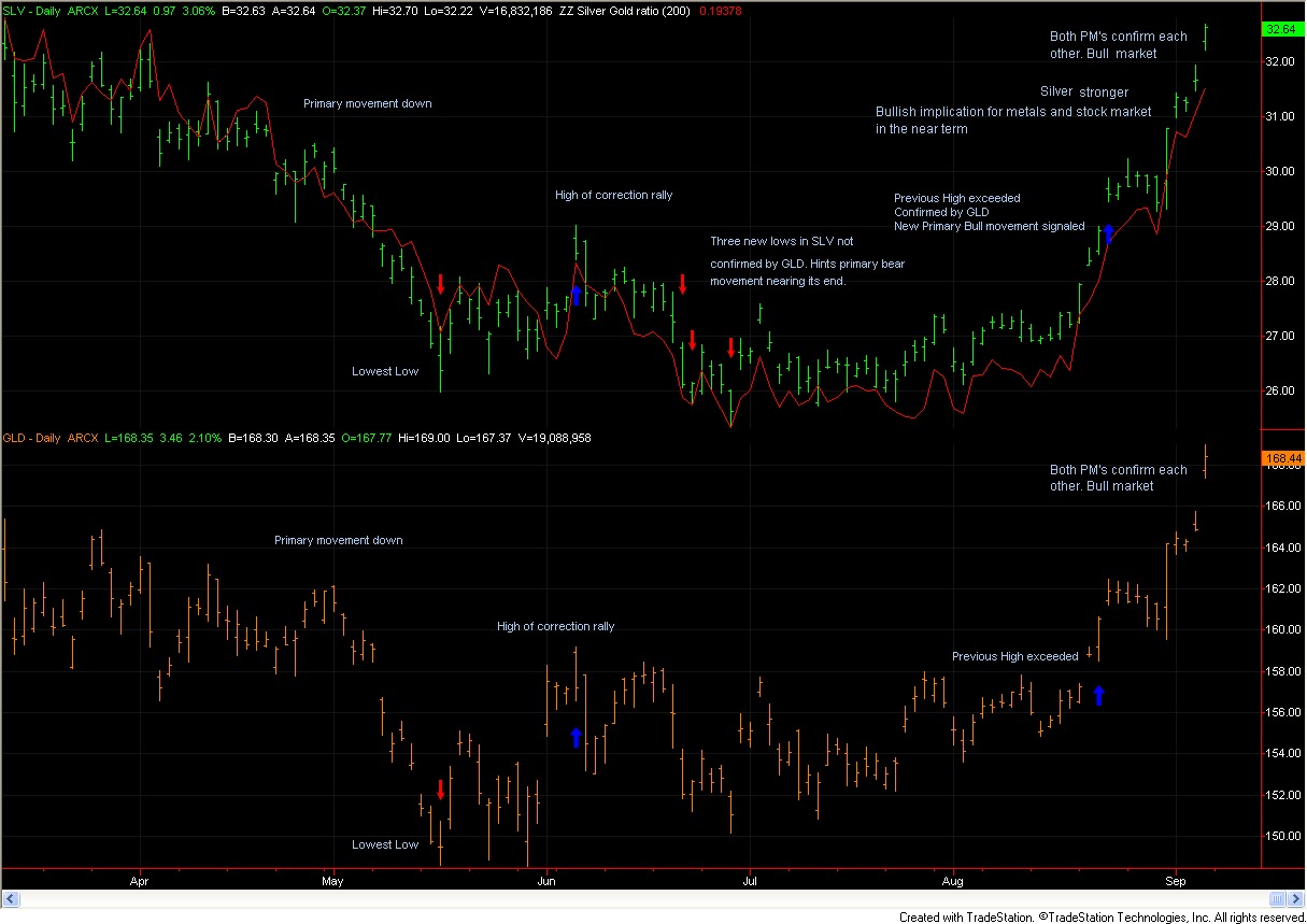 Under Dow Theory SLV and GLD solidly bullish. Now overextended. Silver still leading the parade |