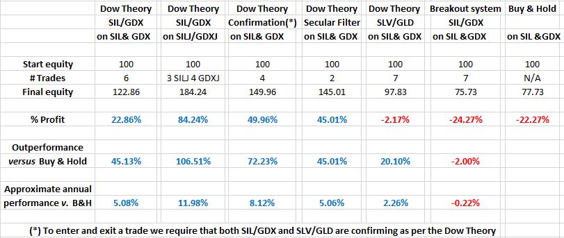 1. The Dow Theory produced outperformance versus BAHin both SLV/GLD and SIL/GDX. Drawdowns were cut by roughly one-half.