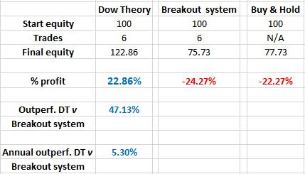 Final capital Dow Theory (starting at 100): 122.86, which translates to an outperformance versusbuy and hold of 45.14%, that is ca. 5.08% p.a. Please mind that the negative “gravitational” force against long positions has been powerful during the period tested, as BAH suffered a maximum decline of -78.58%. Therefore, the outperformance of the Dow Theory versus BAH is remarkable. Confronted with a “negative force” of -78.58%, the Dow Theory managed to net out a positive 22.86% during the period under evaluation.