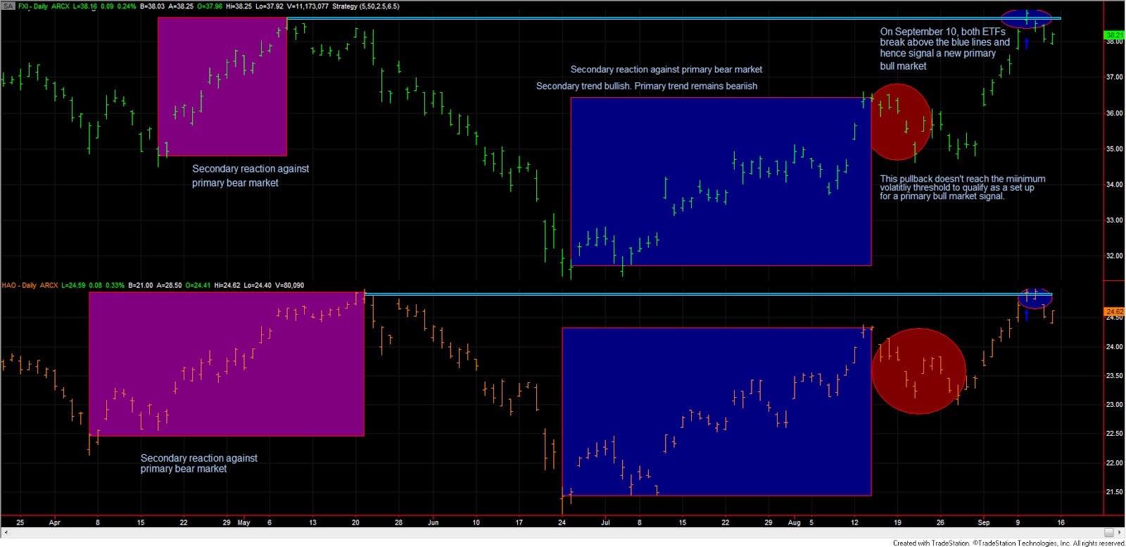 The primary bull market was signaled on September 10, 2013; the FXI closed at 38.79.