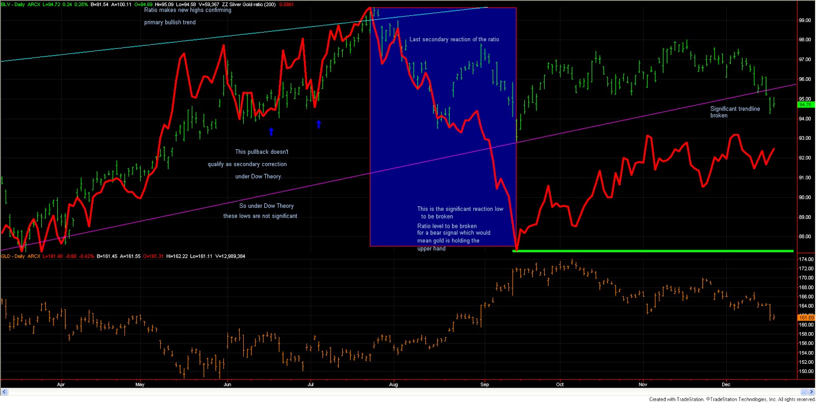 Really, you are seeing a dramatic chart that epitomizes the fight of the bonds (essentially the USD) against the power of gold. Who will win? My fundamental instincts say that gold; however, you know I attach relative value to my own fundamental forecasts, and such fundamental forecasts may take long to come to fruition (longer than you can stay solvent, as Keynes would say). Thus, I prefer the technical side of the Dow Theory to guide me in a time horizon of 1-2 years. One thing is clear: The chart reflects an epic battle.