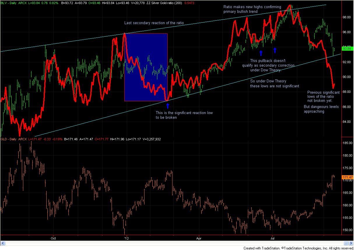 What about the BLV/GLD chart?. Well, according to Dow Theory, and in spite of a secondary correction in favor of gold currently under way, the ratio is still bullish for BLV. If we look at the chart, we see that the ratio is just about to violate the previous significant secondary reaction low. However, this hasn’t happened yet. When this occurs, technically, almost all bets are off.