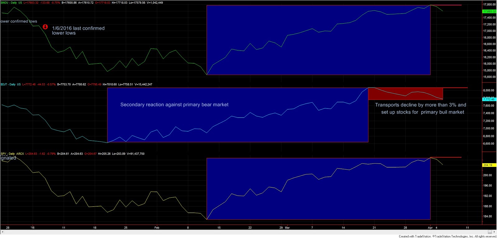 Now, at least the SPY together with other index (preferably, the Transports themselves) should break above the last recorded secondary reaction closing highs.
