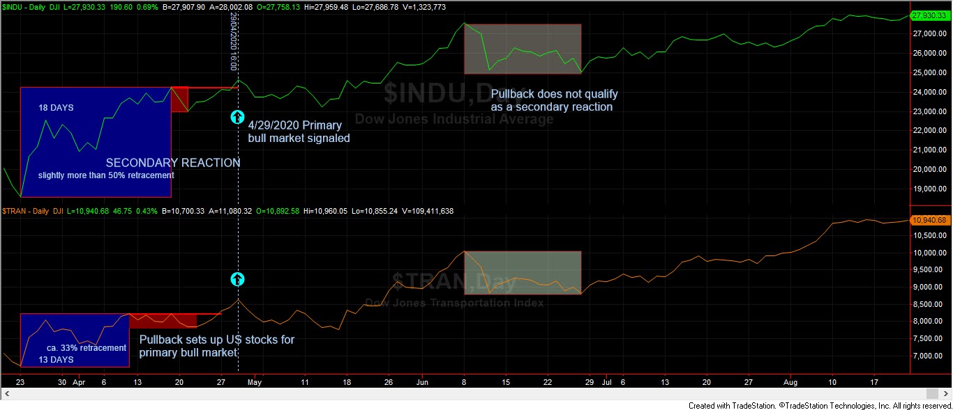 On 7/20/2020, the S&P 500 bettered its 6/8/2020 primary bull market highs unconfirmed. On 8/4/2020 and 8/10/2020, the Transports and the Industrials confirmed, so the secondary reaction was canceled, and the primary bull market reconfirmed.