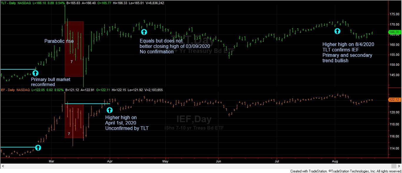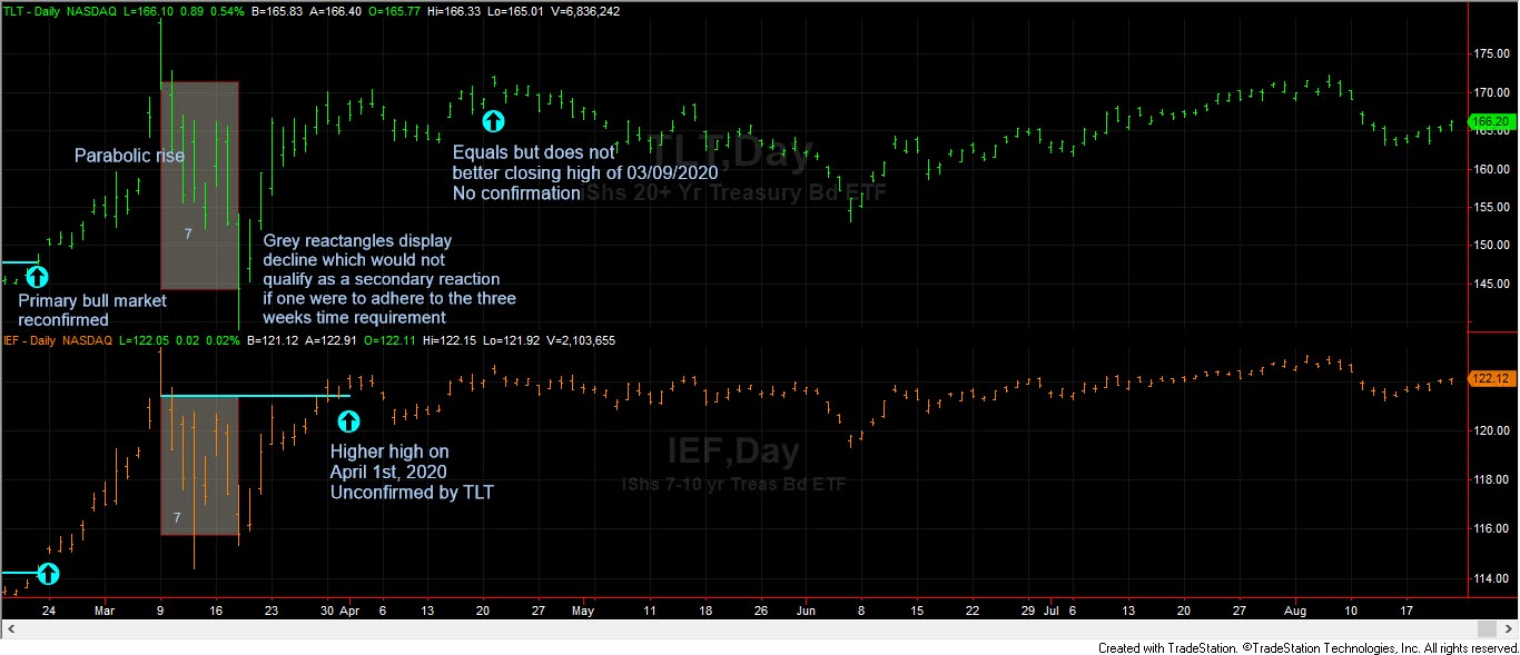 On 04/01/2020, IEF bettered its last primary bull market closing highs of 03/09/2020 unconfirmed by TLT. On 08/04/2020, TLT finally deigned to confirm and broke up its 3/9/2020 primary bull market highs, and, hence, the primary bull market was reconfirmed.