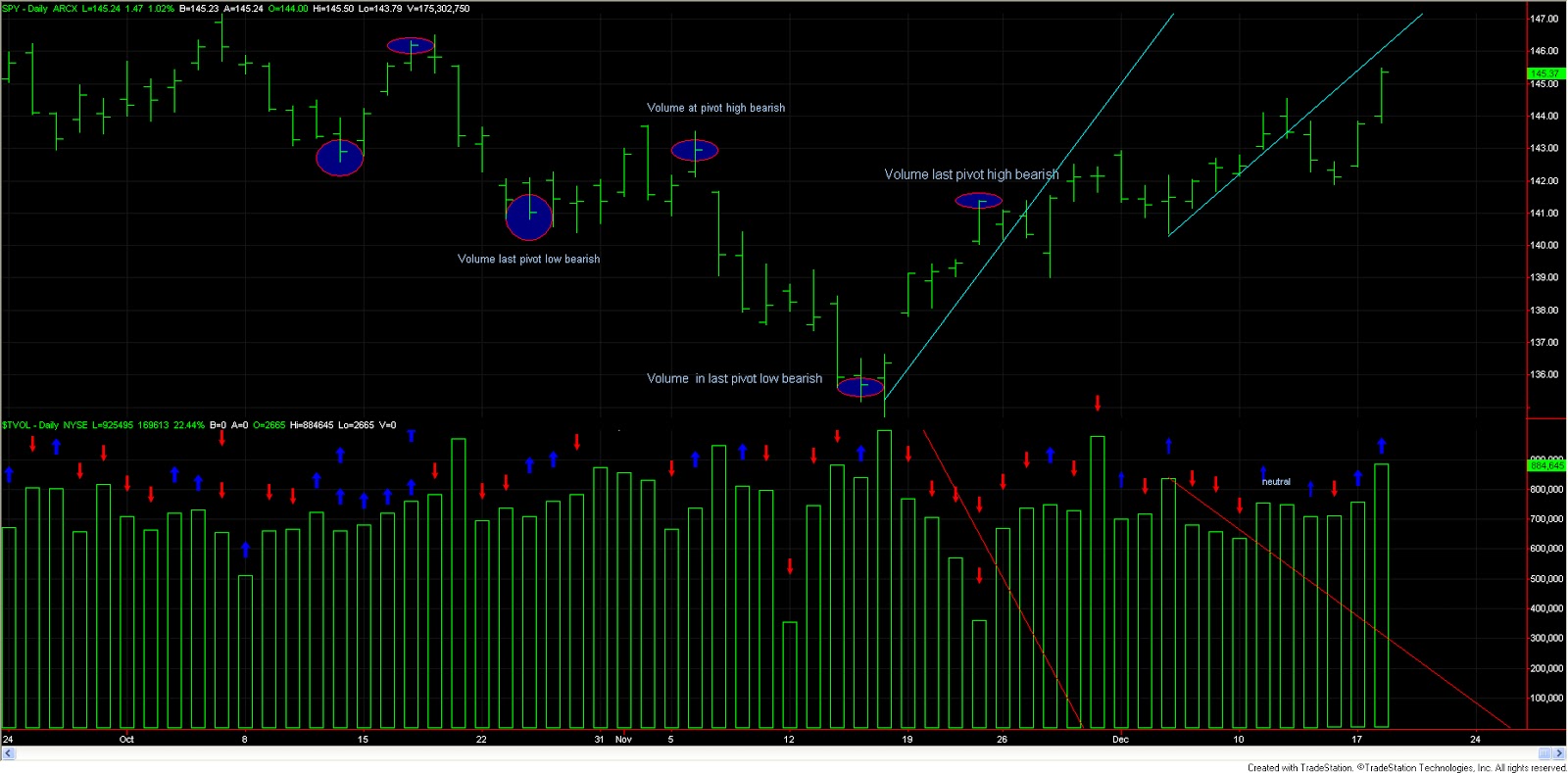 Volume was higher than yesterday’s and since it was an up day, it has a bullish connotation. Volume is becoming neutral. I insist the volume does not make trends but merely qualify them. In other words, I’d say that 90% of our trends are made by sheer price action. Volume serves to merely “fine tune” 10% of the trends made by price action. Or to put it otherwise: If you take 100 trends with confirming volume and 100 trends without confirming volume, the trends with confirming volume are 5% more likely to sport higher price. However, this does not mean that trends without supporting volume are going to fail. They are merely 5% less likely to continue its ascent. This is why volume, while important is always of secondary importance.