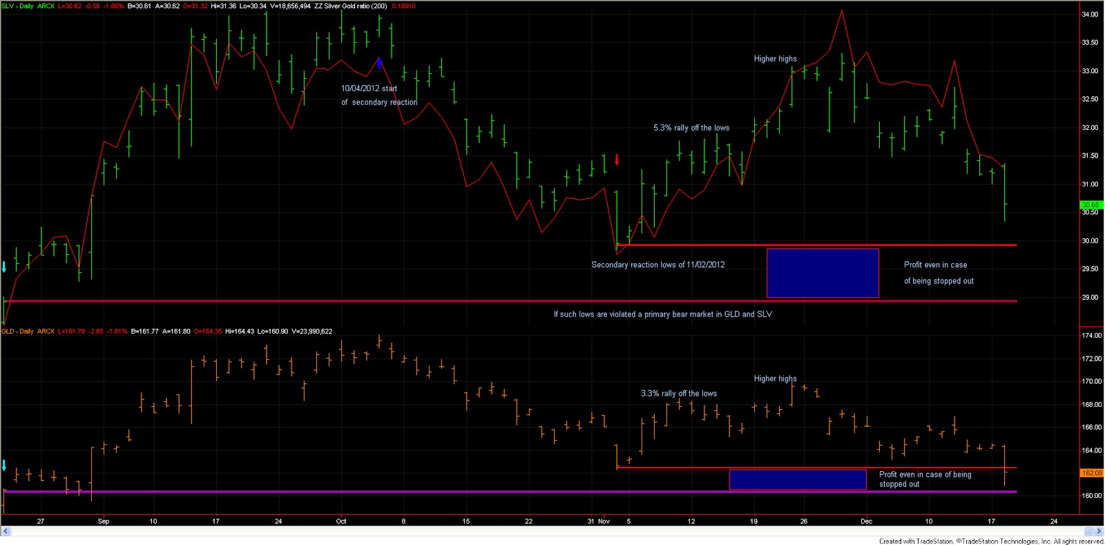 Today was a dramatic day in gold and silver. GLD (gold) violated its Nov 2 secondary reaction lows. Silver (SLV), however, while very weak, refused to violate its Nov 2 lows. So we got today in the precious metals a mirror image of that which is happening in stocks. We have had new lows unconfirmed. When or if silver violates its Nov 2 lows, we will get a confirmed primary bear market signal.