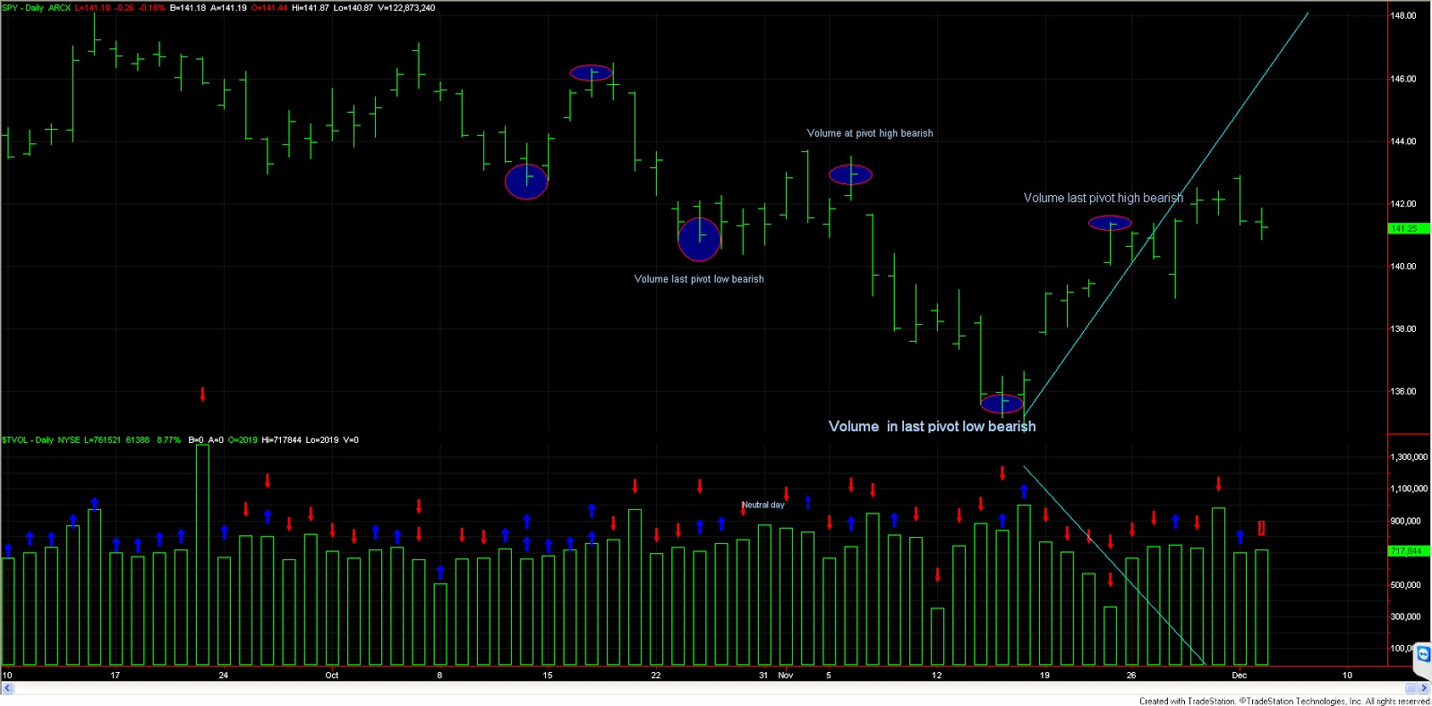 Volume was higher than yesterday’s, since the SPY closed down, I consider it a down day and hence lower prices confirmed by higher volume have a bearish connotation; again. As you can see in the chart below the red arrows dominate.