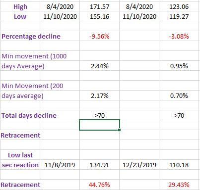 As you can see in the charts and in the spreadsheet below, there has been a long decline off the 8/4/2020 closing highs. As far as retracements are concerned, TLT retraced 44.76% of the previous bull market swing. On the other hand, IEF has only retraced 29.43% of the previous bull market swing. So, we still lag behind the “confirmed” 1/3 retracement. However, given that the pullback has lasted a good many days, I’d be inclined to consider that “extent” requirement has been met too. Furthermore, the fact that between 8/27/2020 and 10/2/2020, there was a line that was broken down on 10/5/2020 seems to confirm the change of the secondary trend from bullish to bearish even under a strict interpretation of the Dow Theory. All in all, one can safely conclude that on 11/10/2020 (right side of the orange rectangle) a secondary reaction was signaled. Off the 11/10/2020 lows, a rally ensued which finished on 11/20/2020. This rally has two consequences: