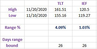 So IEF clearly fits the bill. TLT’s 4.09% range very slightly exceeds that of 3.93% (the theoretical maximum). However, given that the line has been in existence for 26 trading days (so this is slightly more than a full trading month), I feel we can safely accept 4.09% as a tight enough movement.