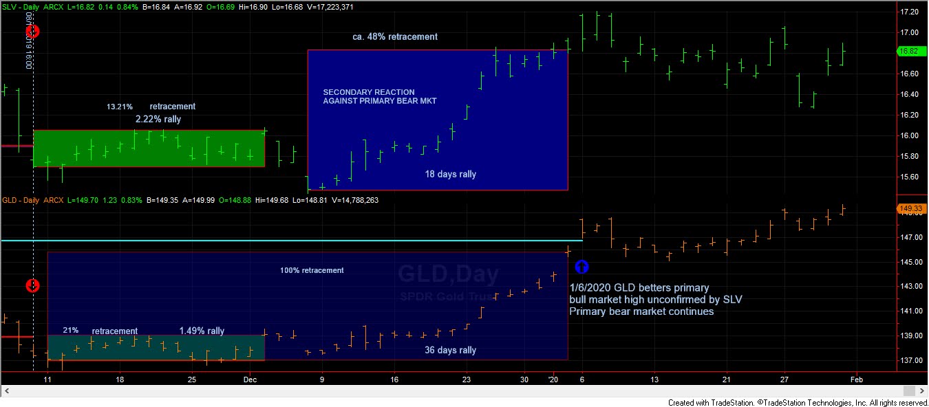 On 1/6/2020 GLD broke up above the last recorded primary bull market highs unconfirmed by SLV. Lack of confirmation implies that we cannot declare the end of the current primary bear market until SLV break up above its primary bull market highs. In the charts below the blue horizontal lines depict the relevant levels to be bettered. The charts below display the price action from mid November 2019 to date.