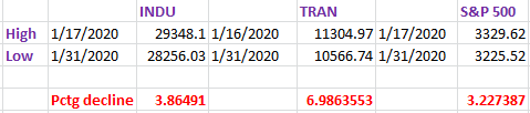 Eight days ago I wrote that I was seeing weakness in the internals of the market (not reflected in the indices). I also wrote that such weakness was harbinger of a change of trends at least of secondary proportions. Well, the developments of last few trading days have resulted in a hefty decline. Yesterday, January 31, both the time and extent requirementsfor a secondary reaction were fulfilled and hence a secondary reaction was signalled. The Industrials and the S&P 500 have declined for 10 trading days, and the Transports have declined for 11 trading days. As per Schannep’s Dow Theory we need at least 8 trading days of declines as the average of the three indices. Furthermore, the decline should exceed 3% on at least two indices.