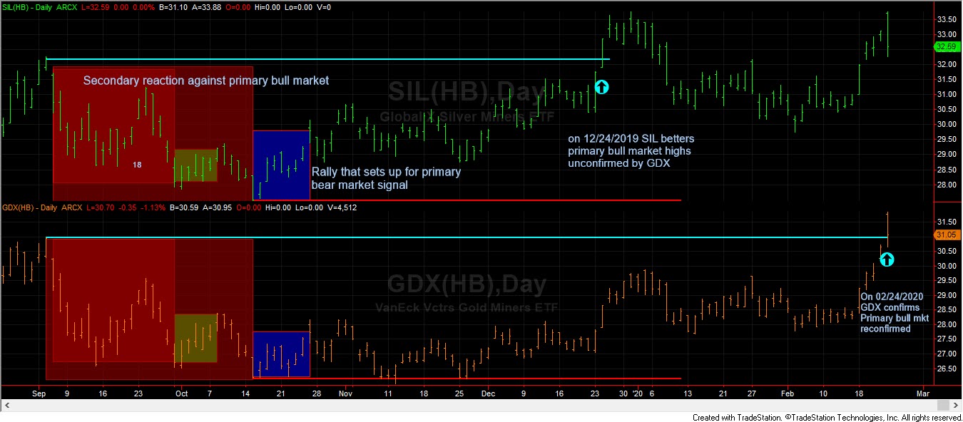 The primary trend is bullish since 12/18/2018 as explained here. On 02/24/2020 the primary bull market has been reconfirmed, as both SIL and GDX have bettered their last recorded primary bull market highs.