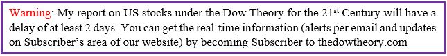 Please mind that lots of interesting research are being published at thedowtheory.com. For example, we are discussing profit objectives, clues as to new secondary reactions, impending tops, tests proving the value of the principle of confirmation, etc. So many things are going in our monthly Letter which are not being published on this blog. So, I encourage you to become Subscribers, as you are missing a great piece of the action. Our “timing” has been spot on. Furthermore, Subscribers are alerted in real-time of any impending Buy or Sell signal, secondary reactions, etc.