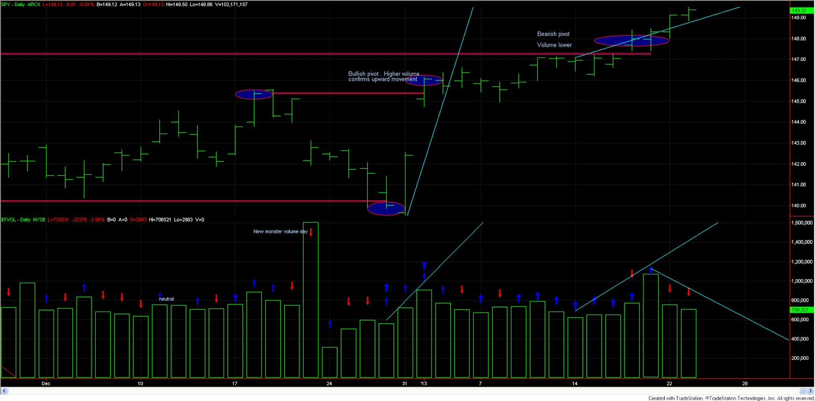 Volume was lower than yesterday’s. Since it was an up day in has a bearish connotation. For the second day in a row we have had diverging volume. In the very short term, the pattern of volume seems to be deteriorating. Here you have an updated chart.