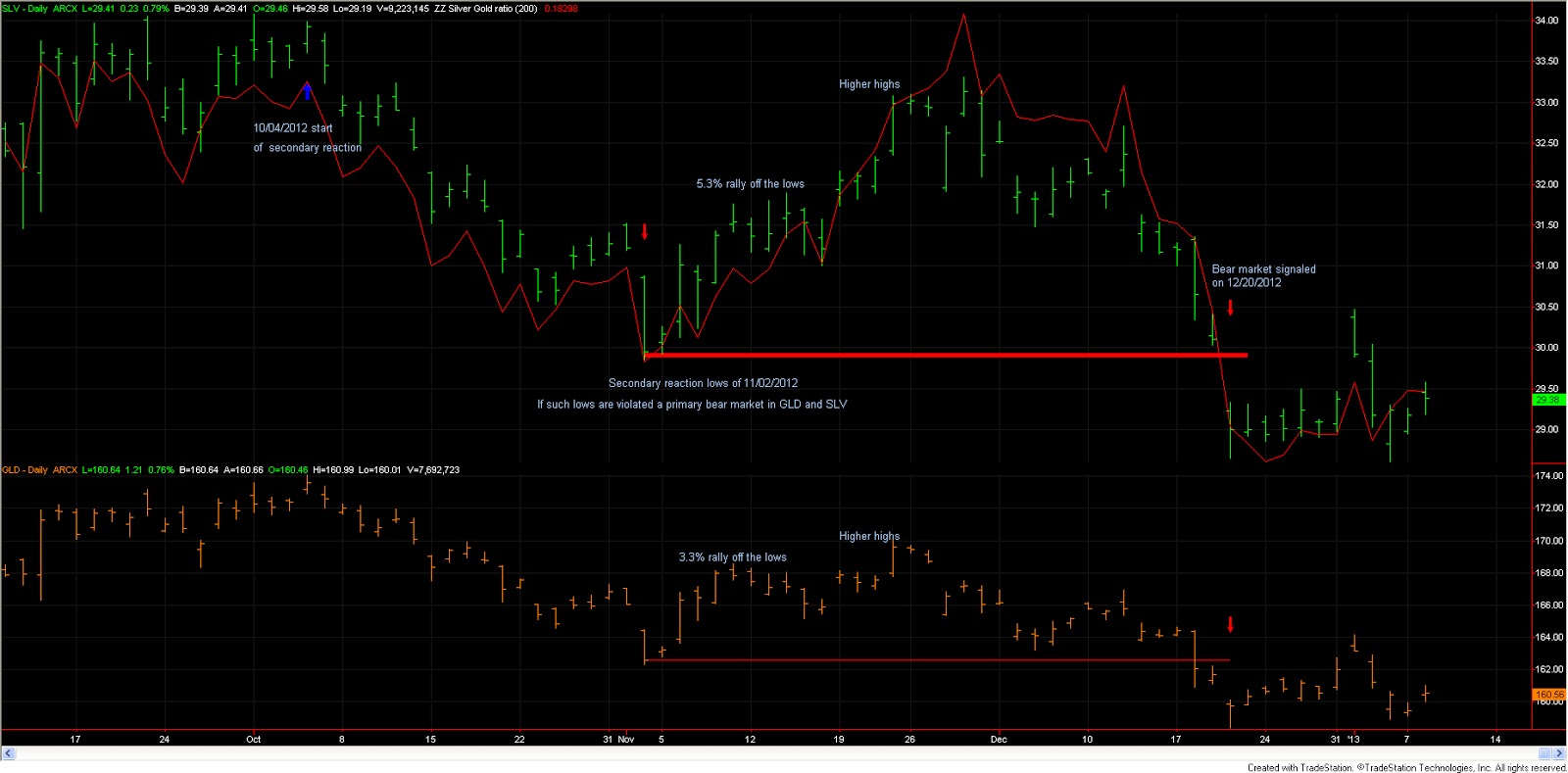 | Bearish picture for GLD and SLV. The primary bear market is fully in force |