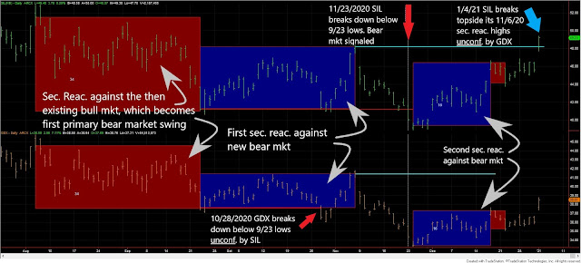 Off the 11/24/2020 secondary reaction lows, SIL and GDX rallied until 12/17/2020. Such a rally setup both ETFs for a primary bear market. Such a rally has more than met the minimum extent requirement as you can see from the spreadsheet below.