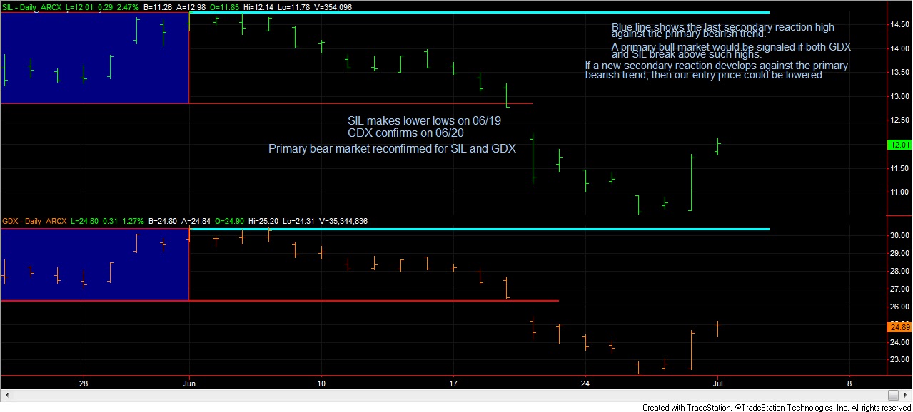 SLV closed down, and GLD closed up. The primary trend is bearish, as explained here and reconfirmed bearish here; the secondary trend remains bearish too.