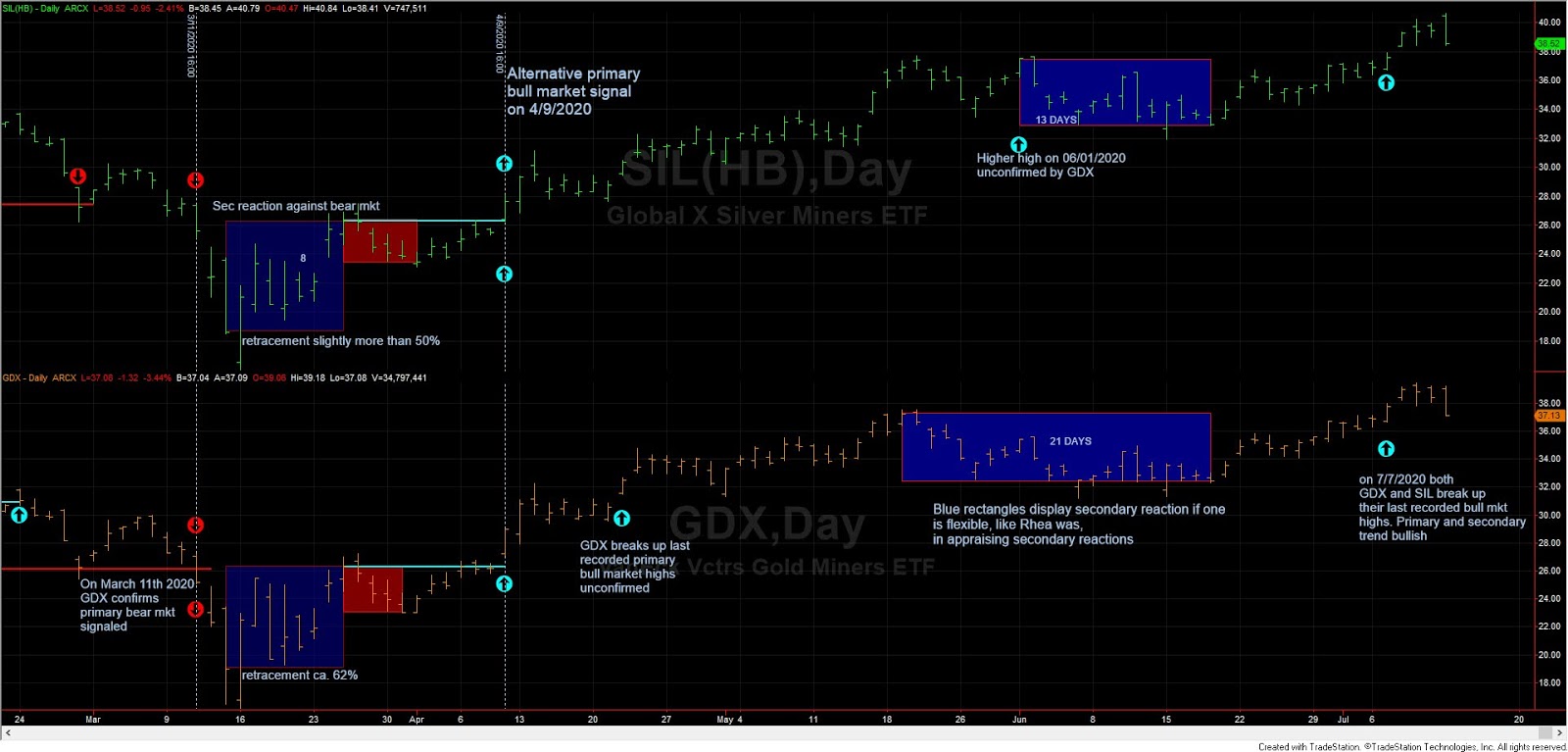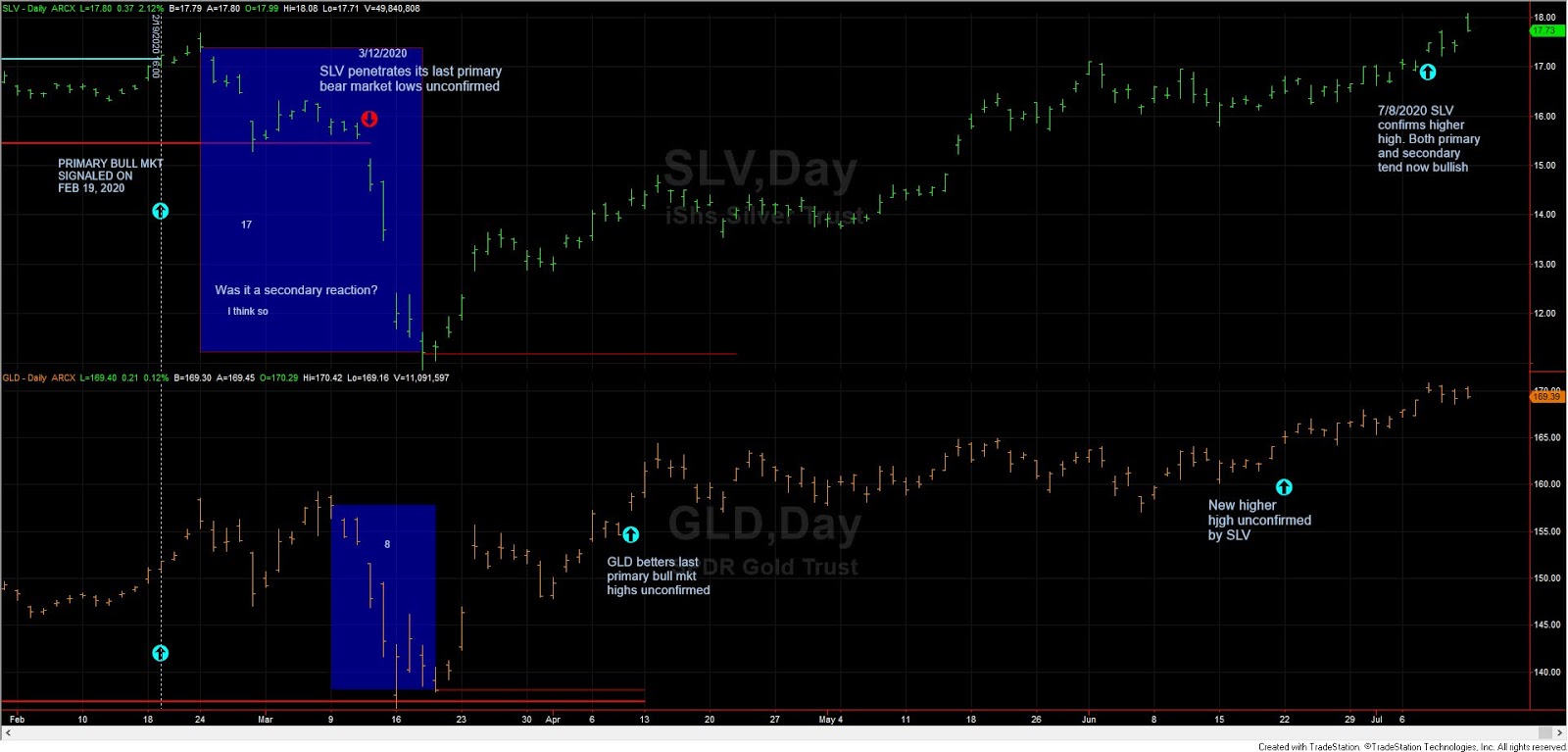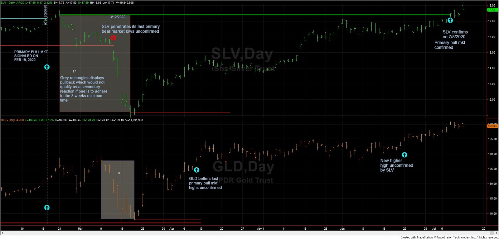 On 4/9/2020 and 6/22/2020 GLD, bettered its last recorded primary bull market highs unconfirmed. SLV finally deigned to confirm on 7/8/2020, so the primary bull market has been reconfirmed, and the secondary trend has turned bullish (end of the secondary reaction).