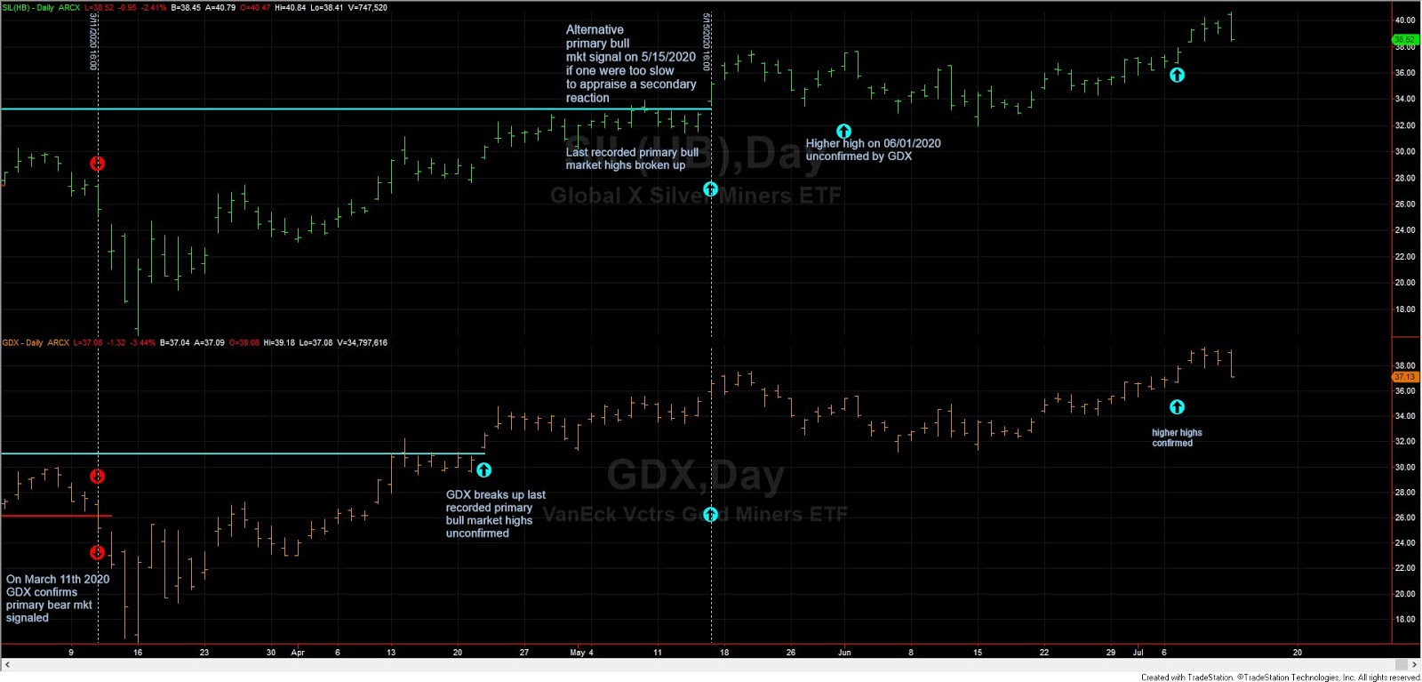 For those wishing to adhere to a more strict interpretation when determining secondary reactions, the primary trend would have remained bearish (bearish signal given on March 11th, 2020, as explained here) until 05/15/2020. On 05/15/2020 SIL finally broke up its last recorded primary bull market closing highs of 12/26/2019, and a primary bull market was signaled. GDX had done so on 4/22/2020. Thus, even under the most restrictive interpretation of the Dow Theory, the primary trend was signaled as bullish on 05/15/2020.