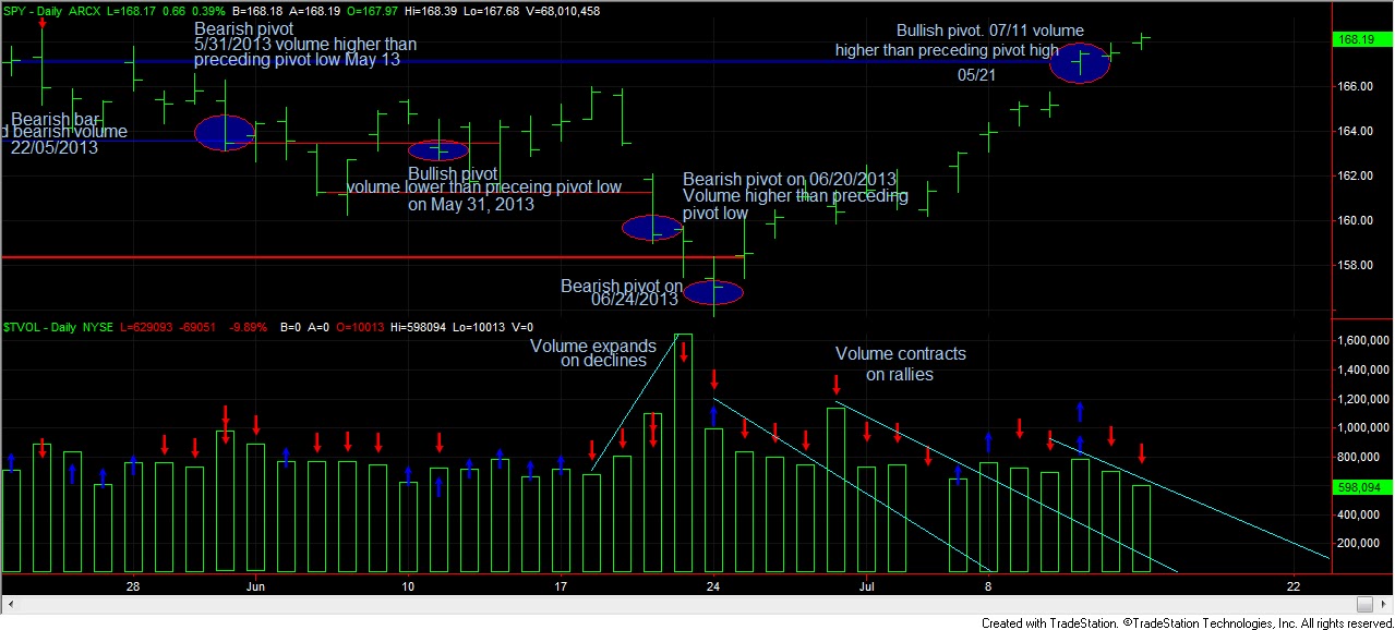Friday’s volume was lower than Thursday’s, which was bearish, as Friday was an “up” day. Today’s volume was lower than Friday’s, which is also bearish. The overall pattern of volume is bearish, as: