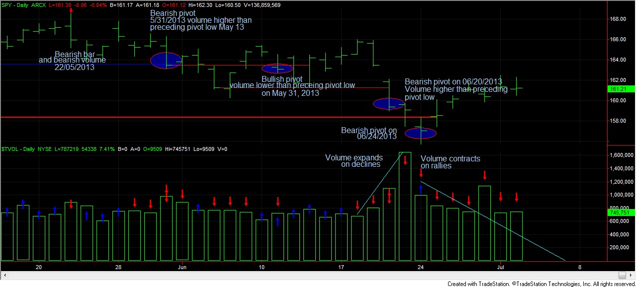 Today’s volume was higher than yesterday’s, which has a bearish connotation as volume expanded with declining prices. The overall pattern of volume is bearish for the reasons explained here. Here you have a chart that shows lots of red arrows (bearish). You can notice that the last six days (3 “up” and 3 “down) have been bearish volume days, which resulted in 6 red arrows. Volume contracts in up days and expands in down days. The updated chart below shows clearly that the trend of volume is clearly bearish: Ascending when prices decline and descending when prices rally.