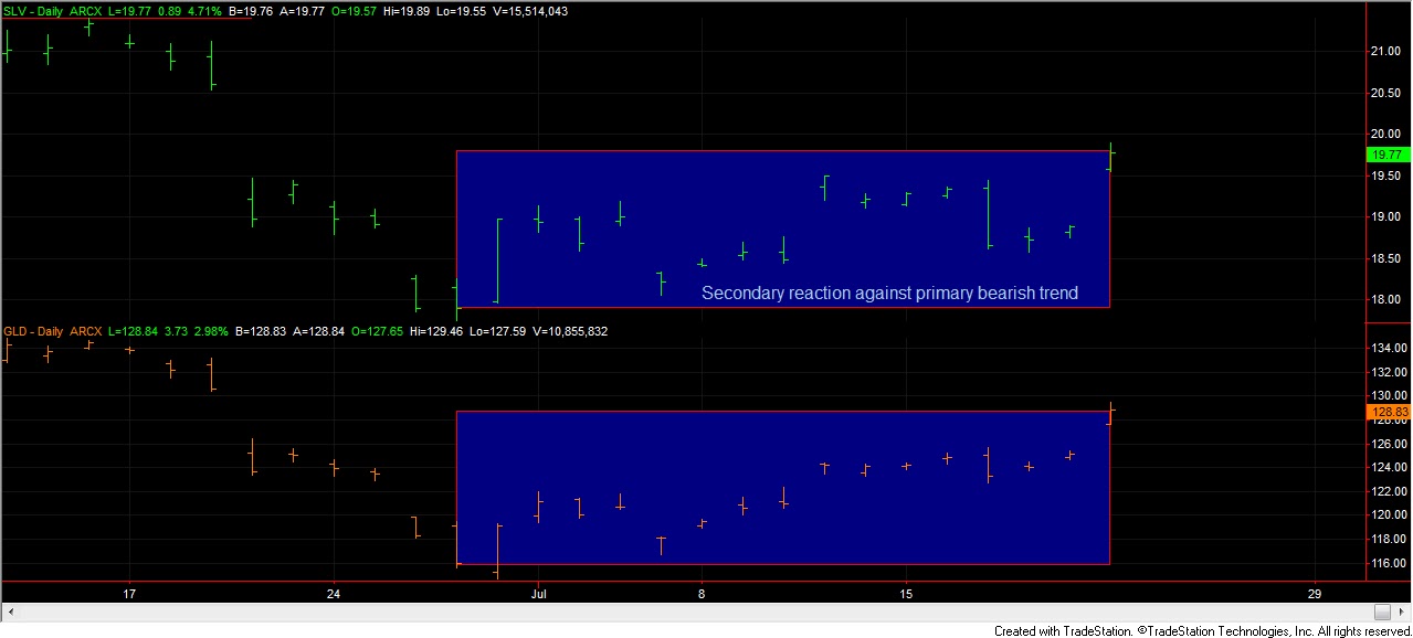 Snapshort of a secondary reaction against the primary bearish trend for SLV, and GLD |