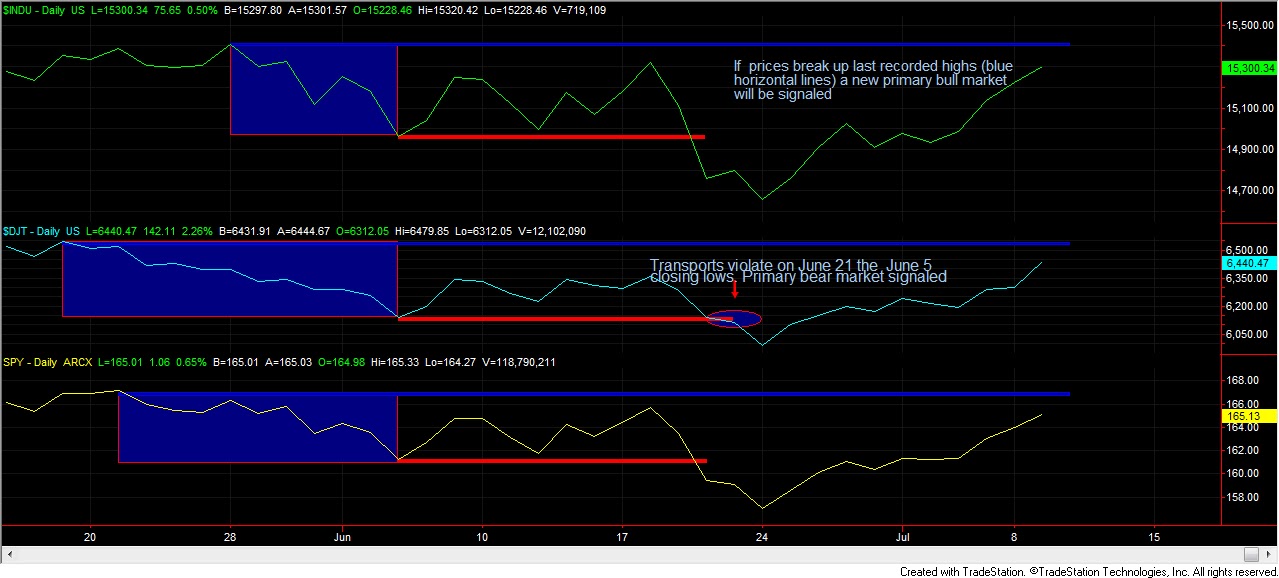 However, as you can see on the chart below, prices are steadily nearing the last recorded highs(actually, the last primary bull market highs). Such highs are shown with a horizontal blue line (the date of those closing highs is: 05/28 for the Industrials, 05/17 for the Transports, and 05/21 for the SPY). If these closing highs are jointly broken, a new primary bull market will be signaled.