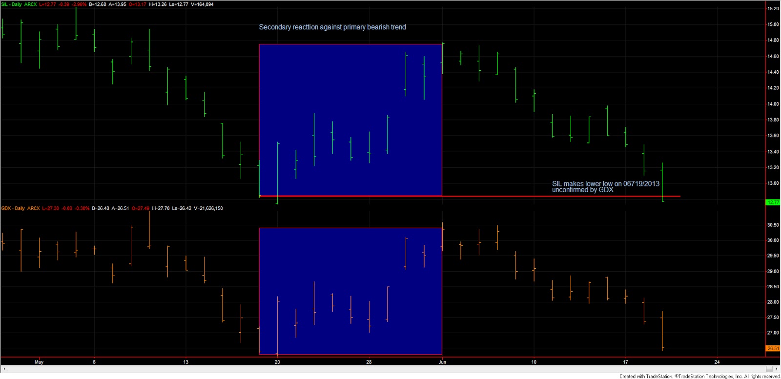 SIL violated the 05/17/2013 primary bear market lows. However, GDX, still holds above such lows, and did not confirm. Such lack of confirmation implies that the primary bear market has not been re-confirmed yet, and, more importantly, that the secondary trend remains bullish. Perhaps the secondary bullish trend is in its death-throes, but until GDX makes a lower low and confirms SIL, the secondary trend remains bullish according to the Dow Theory for the reasons explained here.