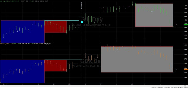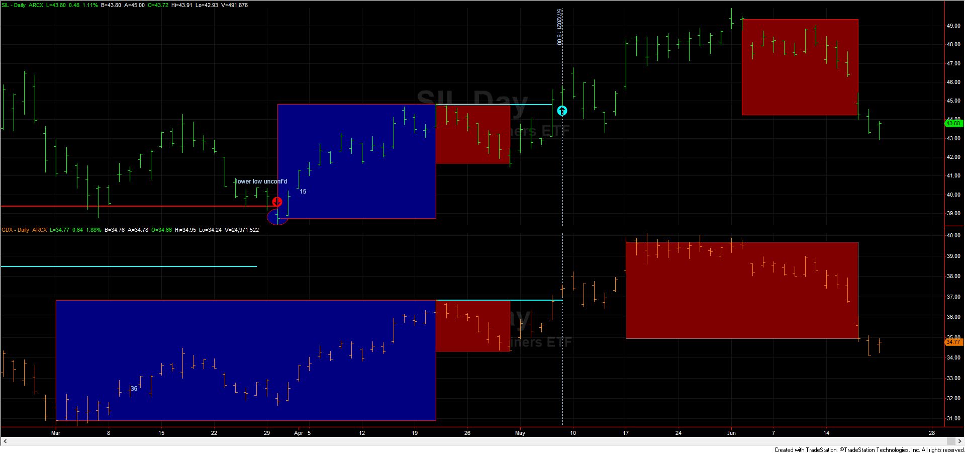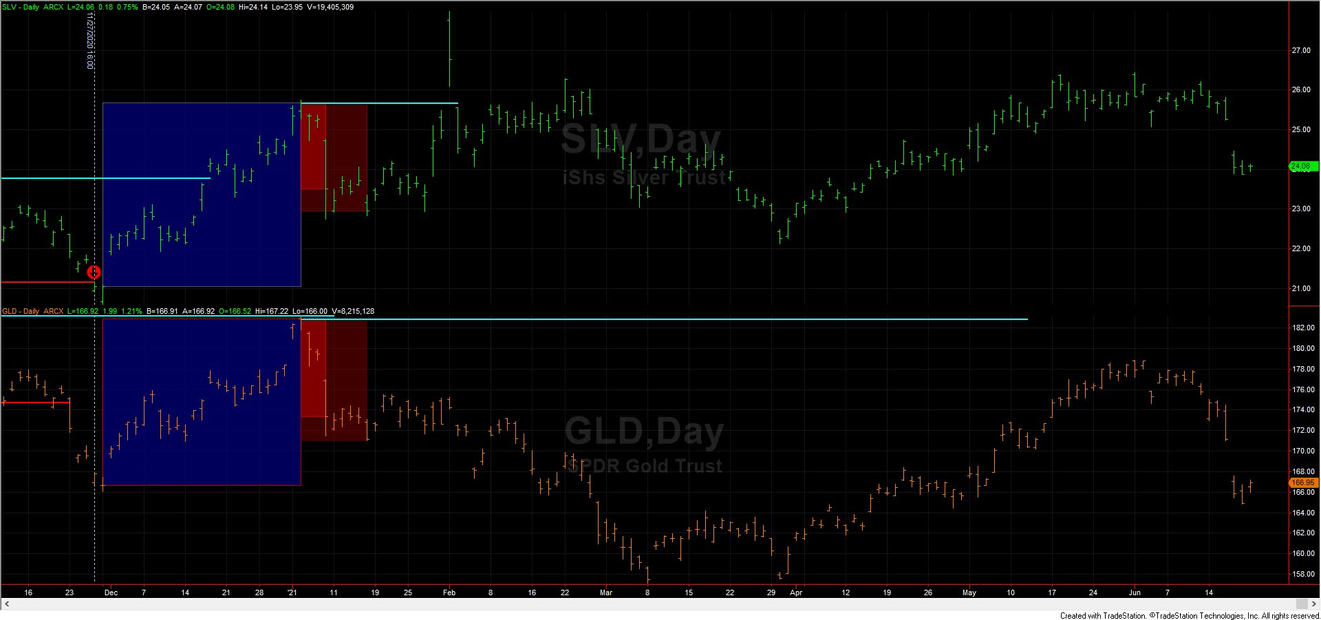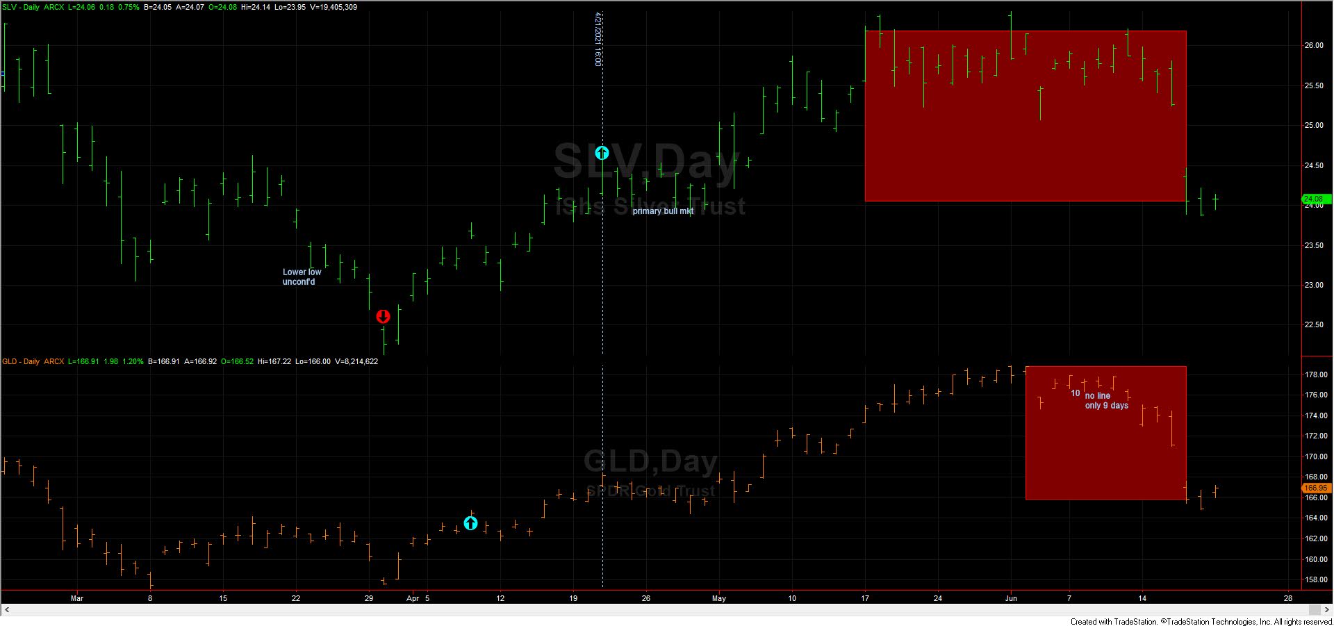 b) Or the markets continue lower until the last recorded primary bear market lows (3/8/2021 at 157.49 and 3/30/2021 at 22.26 for GLD and SLV, respectively) are jointly broken down, in which case a primary bear market would be signaled.