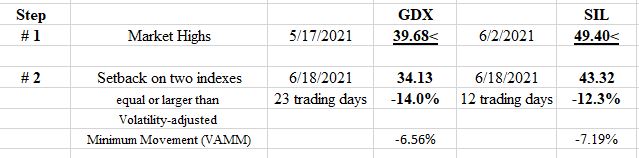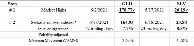 A secondary reaction against the primary bull market has been signaled for gold and silver (GLD and SLV). From its 6/2/21 bull market highs, GLD declined until 6/18/21 for 12 trading days. SLV did so from its 5/17/2021 highs until 6/18/21 for 23 trading days. So we consider the time requirement as fulfilled.