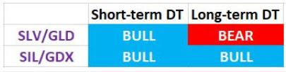 The spreadsheet below displays the primary trend in the pairs SLV/GLD and SIL/GDX when we appraise them with either the “shorter-term” or longer-term interpretation of the Dow Theory. Red color displays a primary bear market (cash), and blue displays a primary bull market.