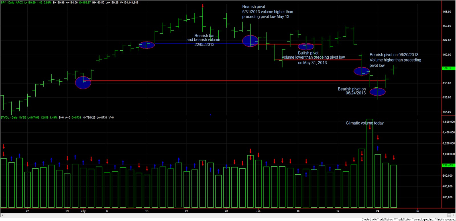 Today’s volume was lower than yesterday’s, which is bearish as ascending prices were not joined by raising volume. The overall pattern of volume is bearish for the reasons explained here. Here you have a chart that shows lots of red arrows (bearish). You can notice that the last two days of price advance have not been confirmed by volume, which has grown smaller and smaller.