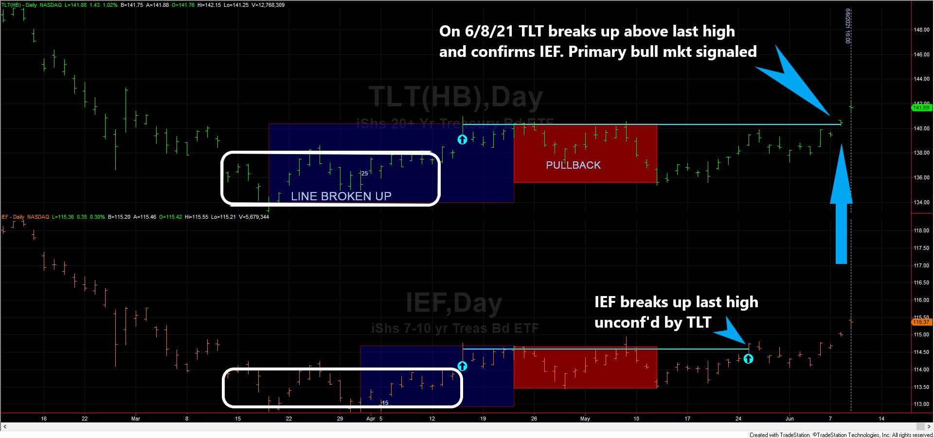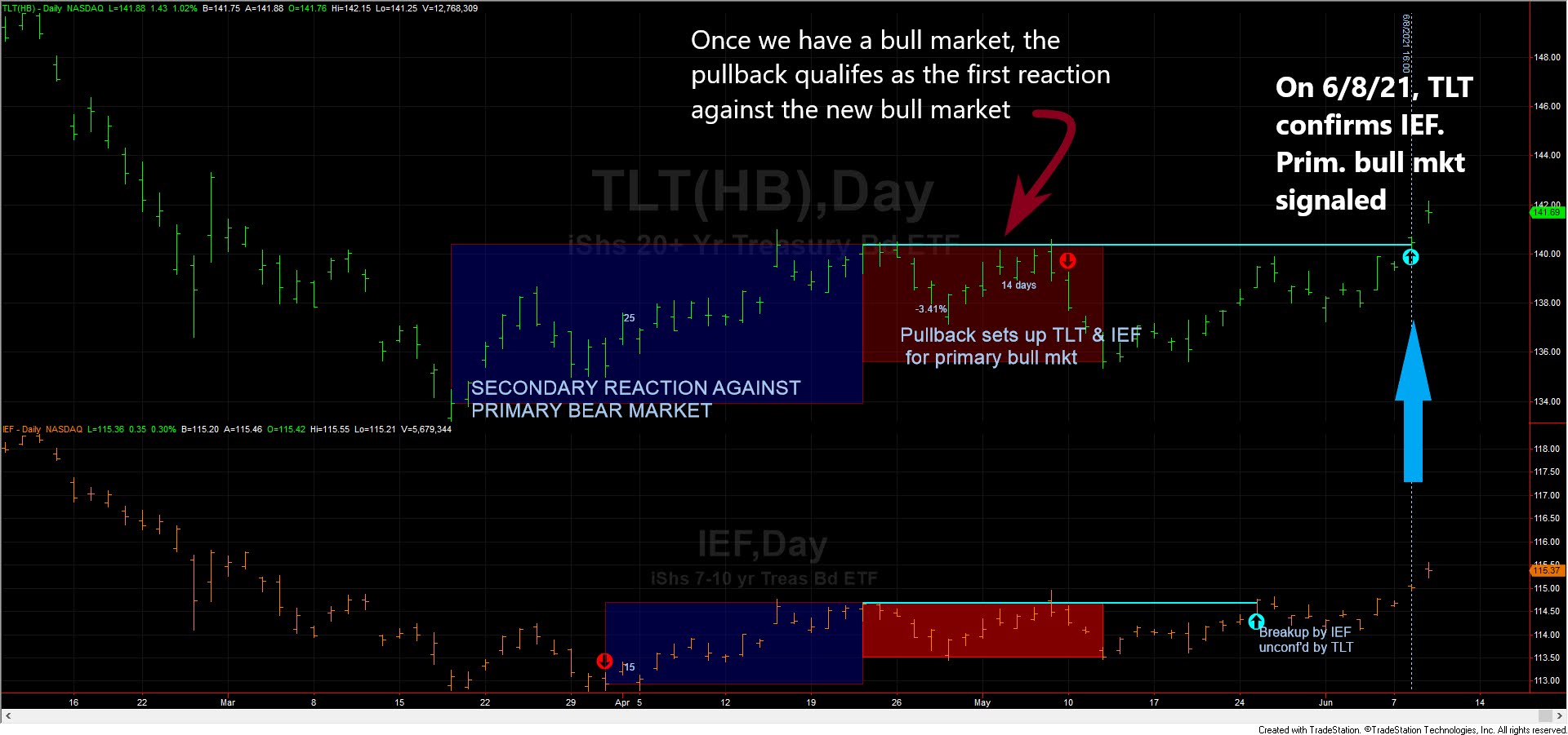 On 5/25/2021, IEF broke up above its 4/22/2021 secondary reaction closing highs unconfirmed by TLT. The awaited confirmation came on 6/8/2021 when TLT broke topside its 4/22/2021 secondary reaction highs and, hence, a primary bull market was signaled.