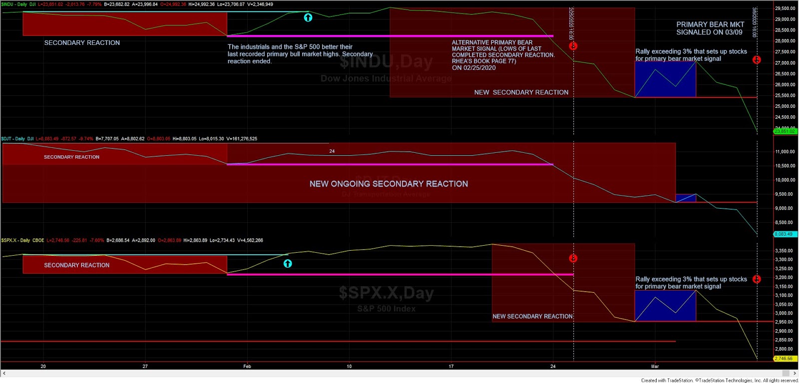 Here you have an updated chart. It begins on the left side with the “last completed” secondary reaction (orange rectangles). The pink thick horizontal lines depicts the relevant levels to be violated for an alternative sell signal to be signaled. The next orange rectangles (middle right side of the chart) depicts the current secondary reaction, the rally than followed which setup US stocks for a primary bear market, and the subsequent penetration on March 9th of the 02/28 secondary reaction lows which resulted in the new primary bear market signal. Study it carefully as there is a wealth of information therein.