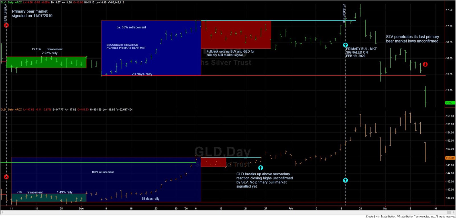 In just four days SLV declined drastically and almost violated the last recorded primary bear market lows. GLD declined but on a much more muted basis. Hence, the decline does not meet the time requirement for a secondary reaction.