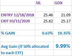I don’t have much time left. It suffices to say that the current trade was a winner. The spreadsheet below shows the dates of entry and exit and their respective closing prices. As you can see, SIL, the weakest of the pack, made 0.63% whereas GDX made 19.35%. While I don’t necessarily advocate for splitting one’s funds 50/50 (as there might be better options to be explored in the future), if one had done so the average gain would have been 10%