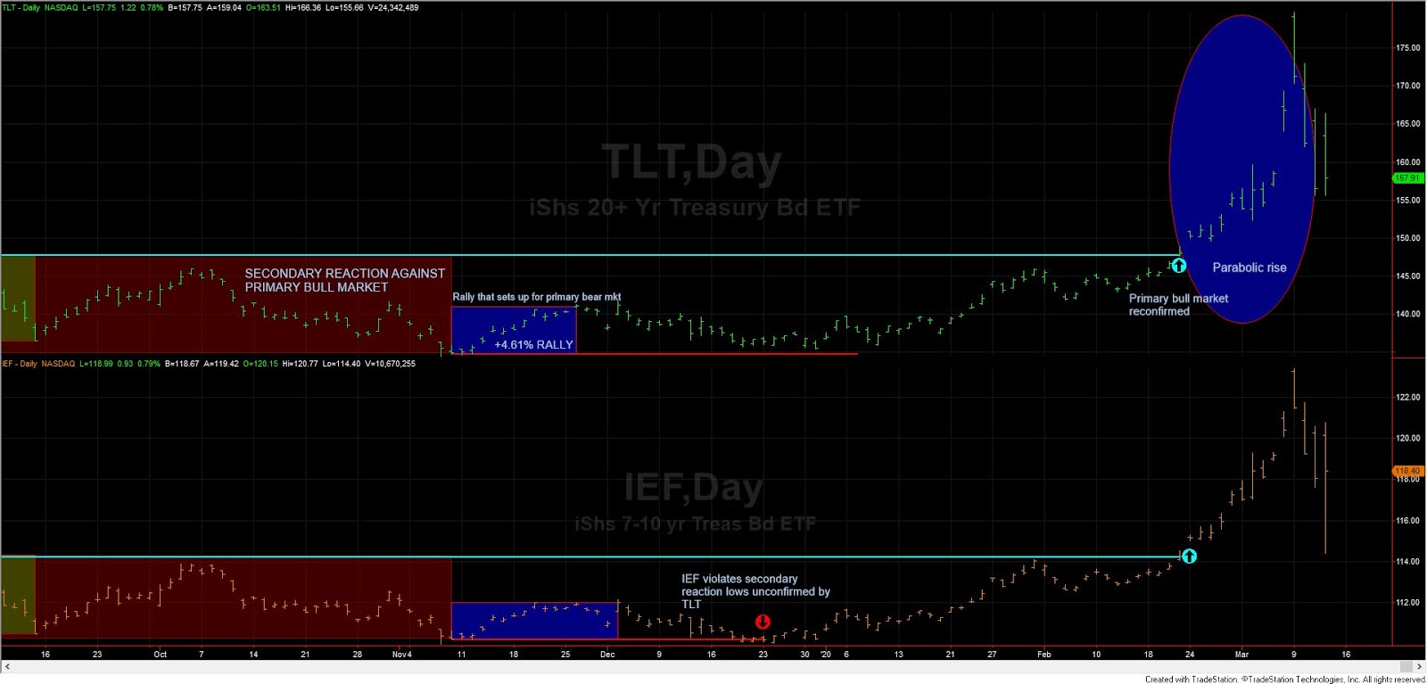 On 02/21/2020 TLT bettered its last recorded primary bull market highs of 08/28/2019. On that date IEF equalled (but did not better) its last recorded primary bull market highs of 09/04/2019, and hence there was no confirmation. On 02/24/2020 IEF did better its primary bull market highs and, therefore, we can declare the secondary reaction has ended, and the primary bull market as reconfirmed.From the reconfirmation date of 02/24/2020 TLT and IEF have gone almost parabolic reflecting the current chaos which is plaguing all markets.