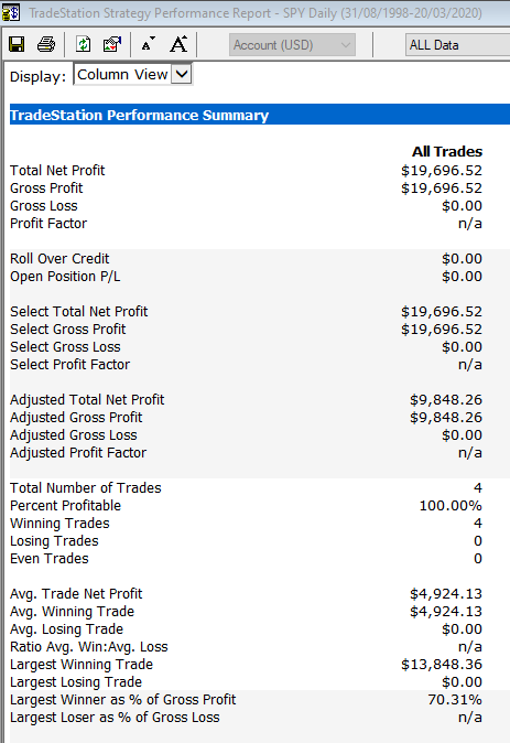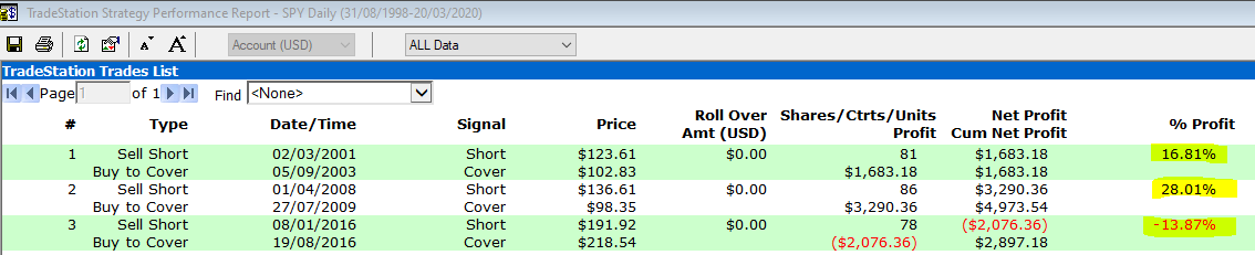 Here you have the three closed trades that would have been taken (the current one: enter short on March 20th, 2020, has not been covered yet, so it cannot be included):