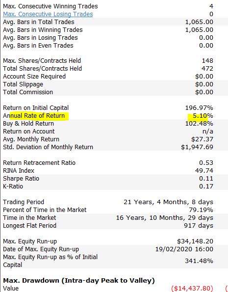 · If we appraise performance from 08/31/1998 to 03/20/2020, CAGR would have been 5.10% which is slightly inferior to the CAGR made on identical period when using daily bars (CAGR of 5.88% not published yet on this blog).