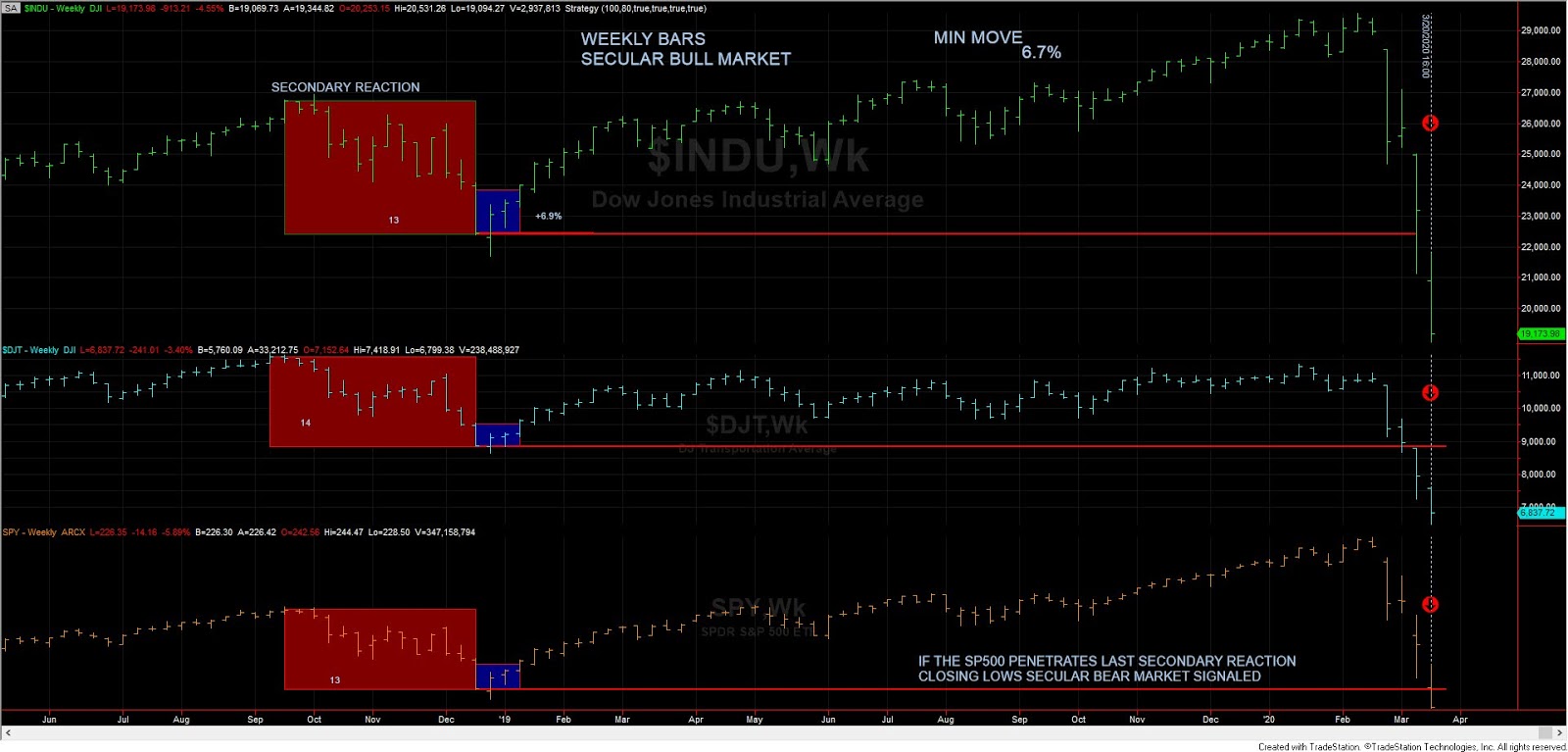 Furthermore, the lows of the secondary reaction were followed by a rally exceeding 6.7%, so the setup for a secular bear market was completed. Such secondary reaction (and the setup for the secular bear market) was nullified when the INDU and S&P 500 bettered their secondary reaction highs. However, even though the secondary reaction was ended, it remains a valid exit point, as I repeat ad nauseam in this blog. So, last Friday March 20th, 2020, when the weekly bar was completed, the lows of the last completed secondary reaction were penetrated by the S&P 500 and Industrials (the Transports had done so last week), and, accordingly, we declare the “secular” trend as bearish.