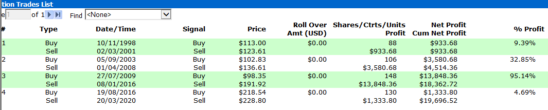 · From 1998 to date there has never been a losing trade. Even the current one, exited more than 30% from the top, has been a modest winning trade.