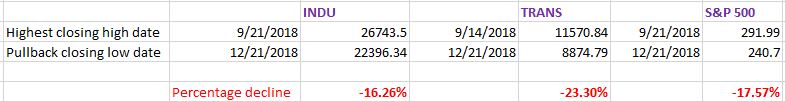 On 09/21/2018 the INDU and the S&P 500 make their highest weekly closing highs. The Transports did so on 9/14/2018. From those weekly highs, the INDU and S&P 500 declined for 13 weeks. The Transports declined for 14 weeks. Hence, the average time of the three indices was more than 8 and the time requirementfor a secondary reaction was met. As to the decline, the minimum movement I require is 6.7%. Why this figure?