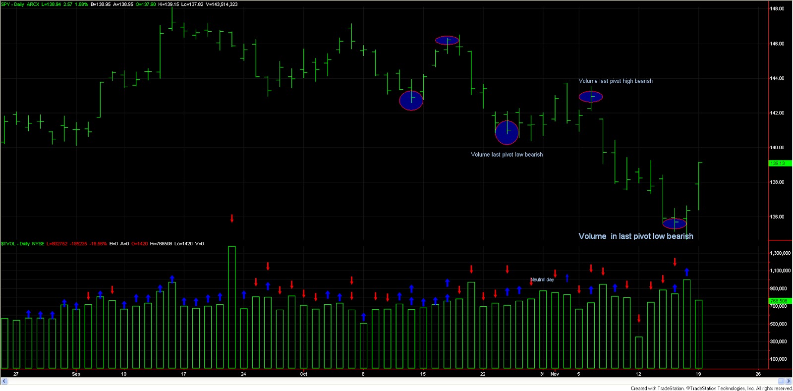 Volume was much lower today, which has a bearish connotation, since it was an up day. Furthermore, the last recorded pivot low had lower volume than that the preceding one (see chart below) which is bearish too. Thus, volume seems to suggest that the bear is holding the upper hand.