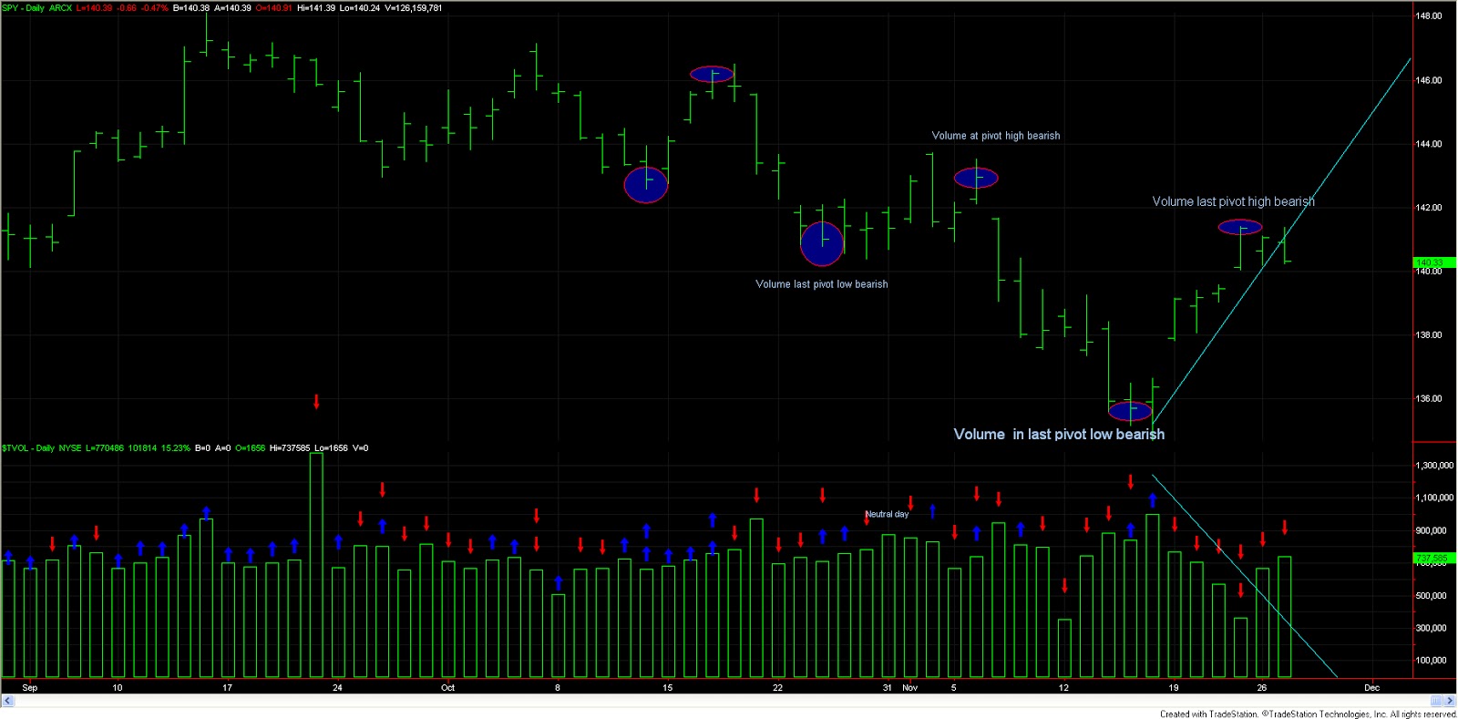 Volume was up in a down day which has a bearish connotation. We have had six bearish volume days in a row. To add insult to injury, the last pivot high made two days ago was on notoriously lower volume than the previous pivot high made on 11/06/2012. This is also a bearish sign. Furthermore, the last two pivot lows as well as the last two pivot highs have displayed bearish volume patterns. The icing on the bearish cake, as you can see in the chart below, has been the declining trend of volume as the market rallied until a couple of days ago. Clearly, price action was negated by volume (see blue trend lines).