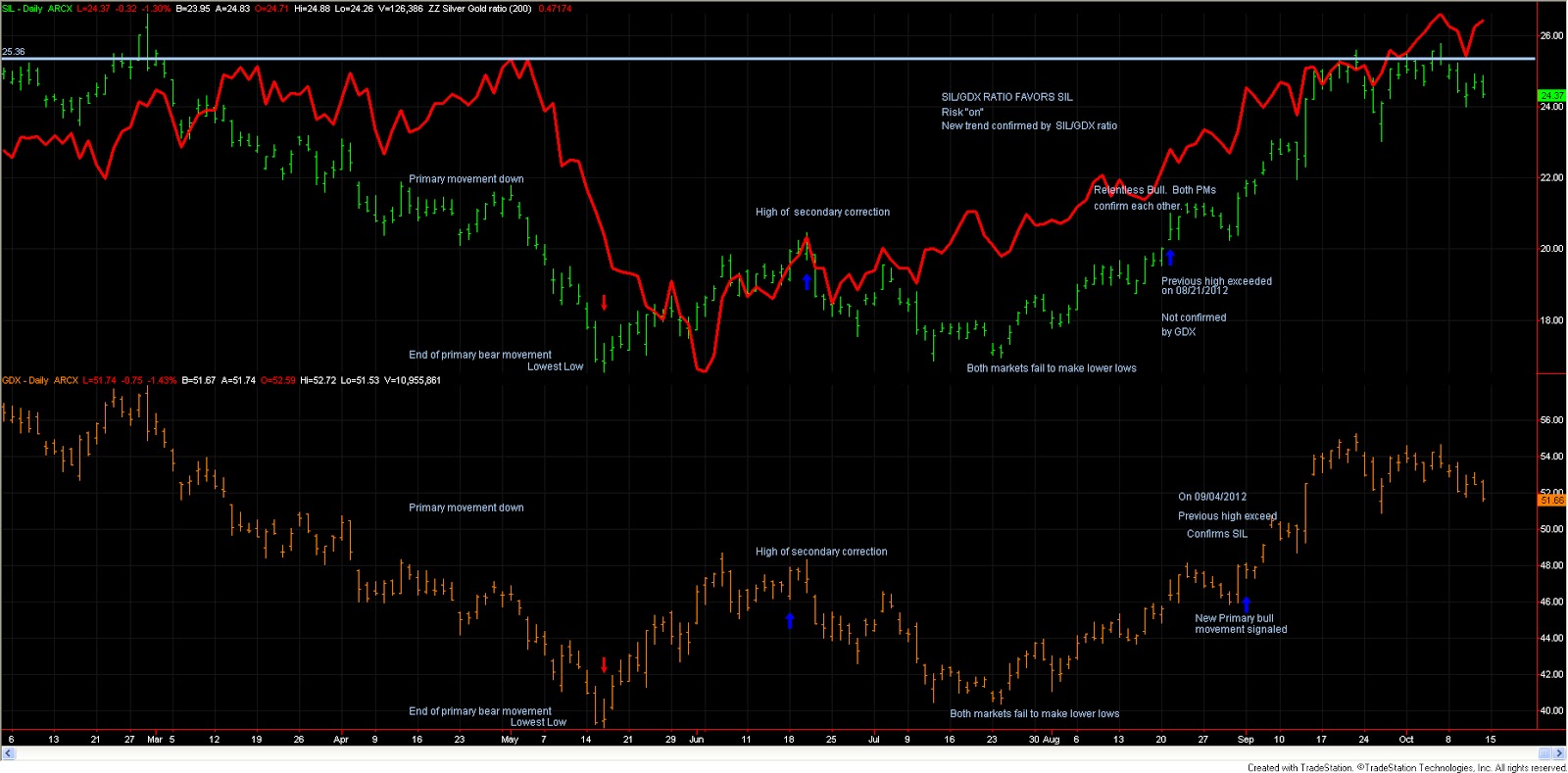 The entire precious metals’ universe had a down day. In silver (SLV) and gold miners (GDX) minor technical damage was made as the 09/26/2012 lows were violated. Under Dow Theory such violation is likely to be deceptive as the new lows in silver were not confirmed by gold. By the same token, GDX new minor lows were not confirmed by SIL. Such law of confirmation forces me to say that the secondary trend of the precious metals’ universe (Gold/Silver and GDX/SIL) remain bullish. It goes without saying that the primary trend remains bullish as well.
