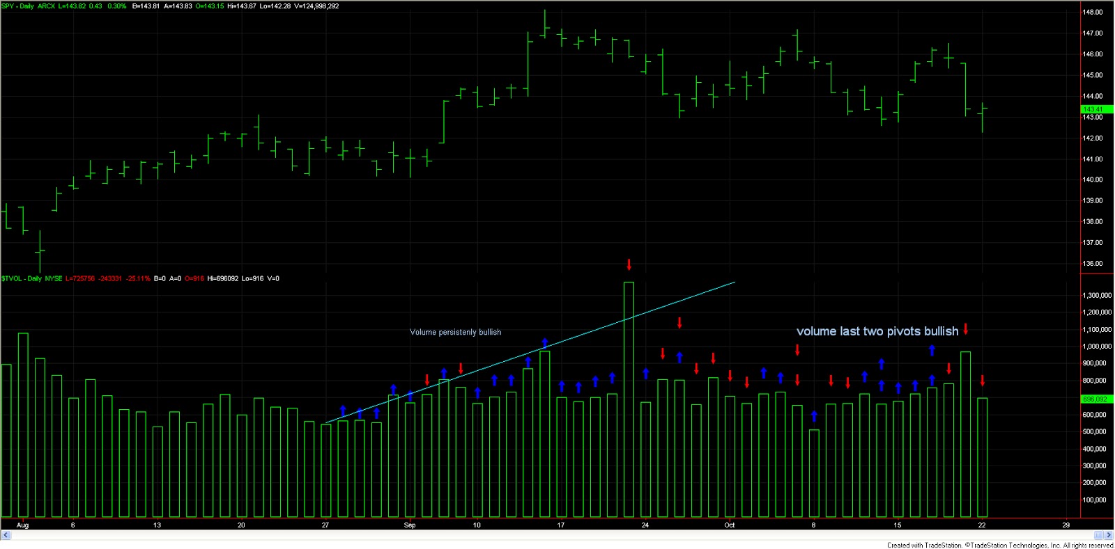 I have put additional arrows in those pivot days. The lower arrow is the arrow you are already used to see: bearish or bullish volume day. The arrow on top represents the volume indication derived at those pivot points. Let’s get started.