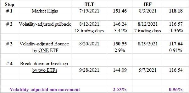 TLT made its last highs on 7/19/21. IEF made its previous closing high on 8/3/21 unconfirmed by TLT (non-confirmation was a warning as to a likely change of, at least, the secondary trend). TLT declined for 18 trading days until 8/12/21 and -3.44%. IEF declined for just 7 days until 8/12/21 and -1,36%. The pullback for both ETFs exceeded the Volatility-adjusted minimum movement (VAMM).