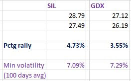 From 09/30/2019 to 10/08/2019 both ETFs staged a rally. That rally, however, lacked the necessary amplitude to setup SIL and GDX for a primary bear market signal (such a rally is highlighted with a green rectangle on the charts below). From that minor rally highs both ETFs declined and extended the secondary reaction by making lower lows on 10/15/2019 (big orange rectangle on the right side of the charts). From that date there was a three trading days rally. Such a rally felt short of the minimum volatility-adjusted requirement in order to set up both ETFs for a primary bear market signal, as shown on the spreadsheet below. More about volatility adjustments here. Hence we have a full-fledged secondary reaction.