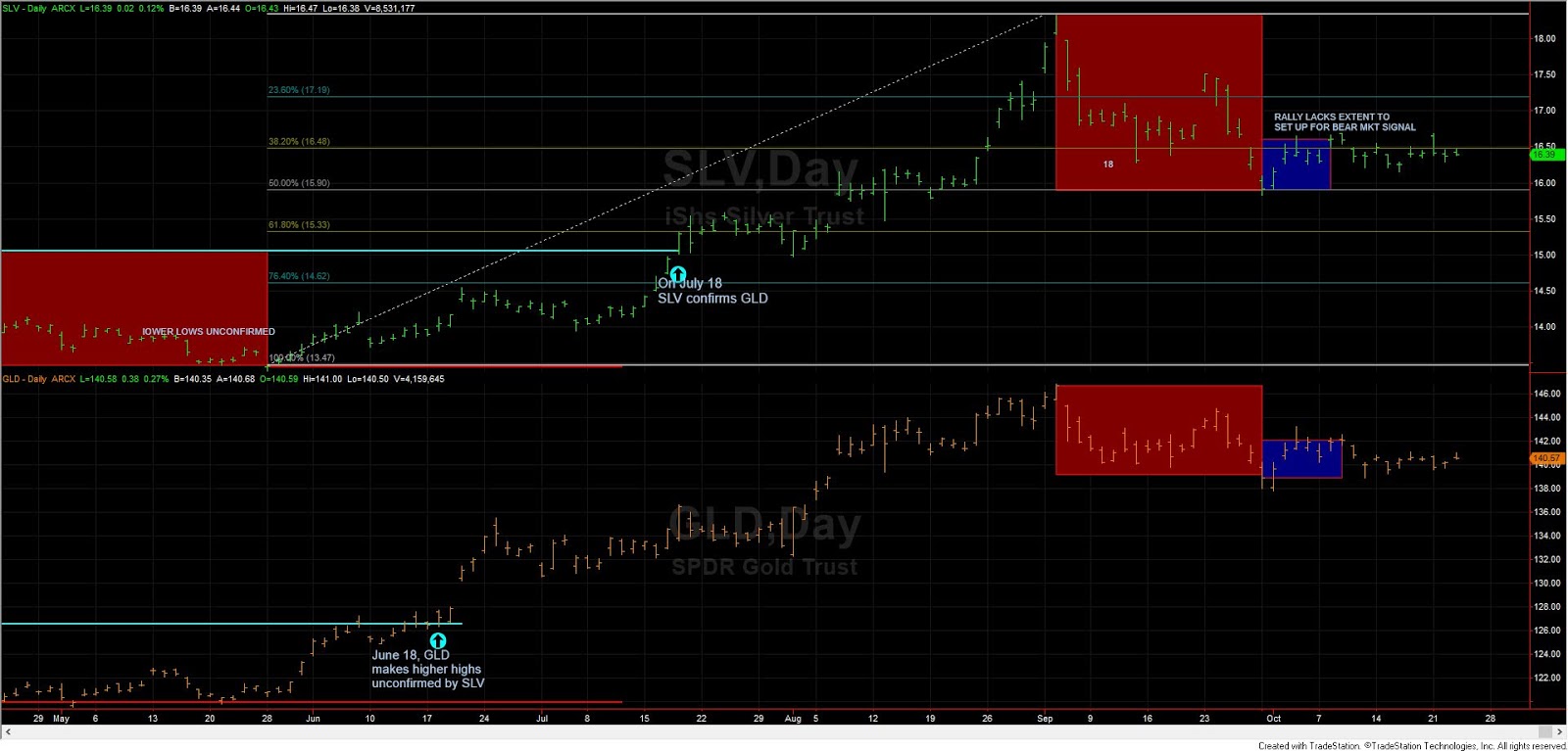 On 09/04/2019 SLV and GLD made its last recorded primary bull market closing highs. From that date both ETFs declined and the secondary trend turned bearish (secondary reaction against the primary bull market) as explained in-depth here.